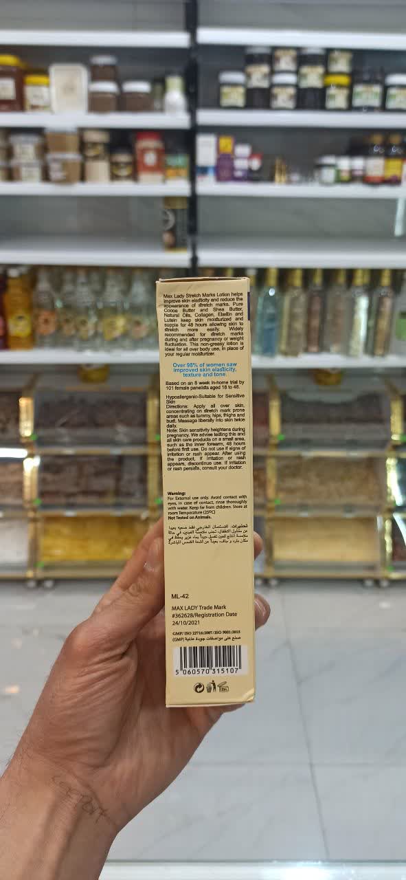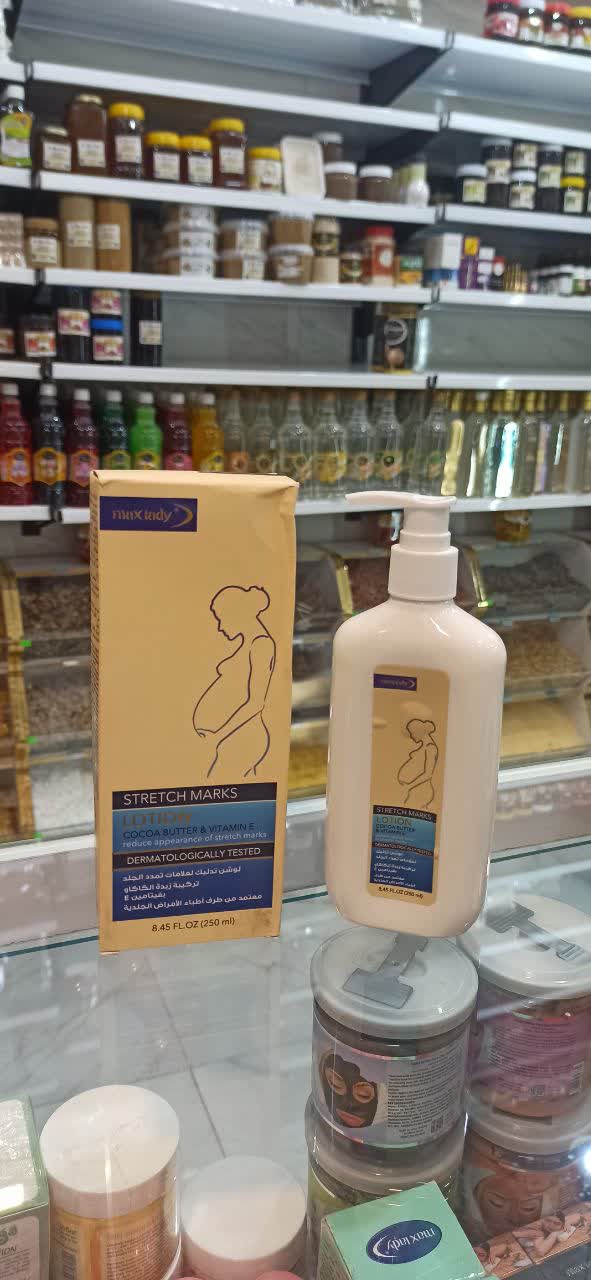 🧴🌰 لوسیون ضد ترک پوستی مکس لیدی Mex Lady با کوکوآ باتر و ویتامین E | نرمکننده، تغذیهکننده و کمک به بهبود ظاهر ترکهای پوستی